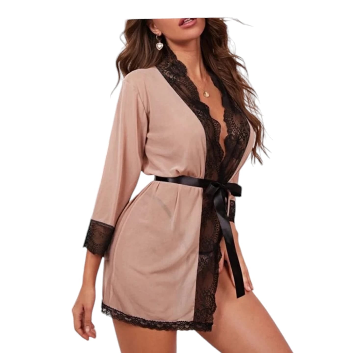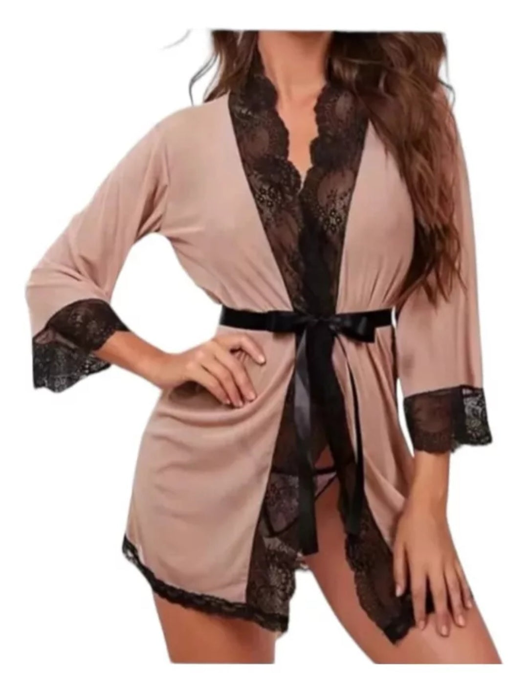 Esta bata corta color beige con delicados encajes abraza tu silueta con suavidad, envolviendo tu piel en un susurro de elegancia y sensualidad. Perfecta para esos momentos donde quieres sentirte especial, coqueta y absolutamente tú.